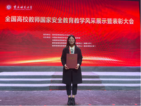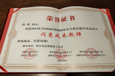 2023年4月7日至4月8日,在教育部思想政治工作司指导下,由中国高等教育学会保卫学专业委员会、全国高校思想政治工作网、教育部高校思想政治工作创新发展中心(湖南大学、重庆师范大学)联合举办的“全国高校教师国家安全教育教学风采现场展示”活动在重庆师范大学举行,我院教师杨愉获得“闪亮风采教师”荣誉称号。