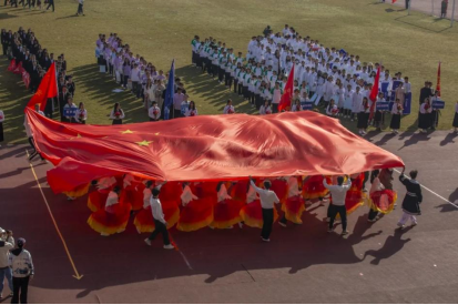 开幕式上,马院方阵伴着激累扬的旋律,踏着矫健的步伐,精神抖擞,意气风发地走在运动场上。他们手持红扇挥舞,飘逸的扇尾划出一阵阵波浪,一艘红船行驶在这红色浪潮中。队伍行至跑道中央,伴随着马院学子铿锵有力的口号声,“马院姓马,在马言马!”,一面巨大的国旗飘过方阵上方,彰显了马院学子传承红色基因,谱写时新篇章的坚定决心。学院的广播操队伍也同样整齐划一,展现出马院学子的青春朝气!在大家的共同努力下,我们成功斩获了团体表演项目广播操一等奖、开幕式观众组织奖、开幕式入场式组织优秀奖三大团体奖项,在校运会中取得头彩,开了个好头。