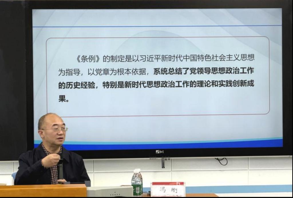 2025年11月25日,北京科技大学思想政治工作研究院院长冯刚教授应邀为我院作题为《<中国共产党思想政治工作条例>的研究思路和研究选题》的专题报告。本次活动在学院408报告厅举行,由学院院长曹清燕主持,近40余名师生聆听。