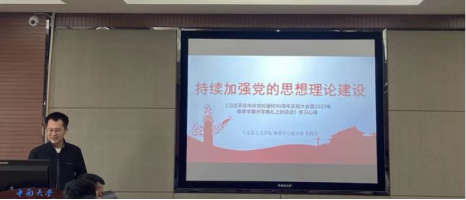2023年4月19日,中国近现代史纲要教研中心党支部于学院610开展主题党日活动,进一步领会党的二十大精神,重点学习习近平总书记在中央党校建校90周年庆祝大会暨2023年春季学期开学典礼上的重要讲话精神,具体围绕思想理论建设主题进行研讨交流。本次主题党日活动由苏广兴、苏鹤立、冯颂颂、王初华四位同志主讲发言。