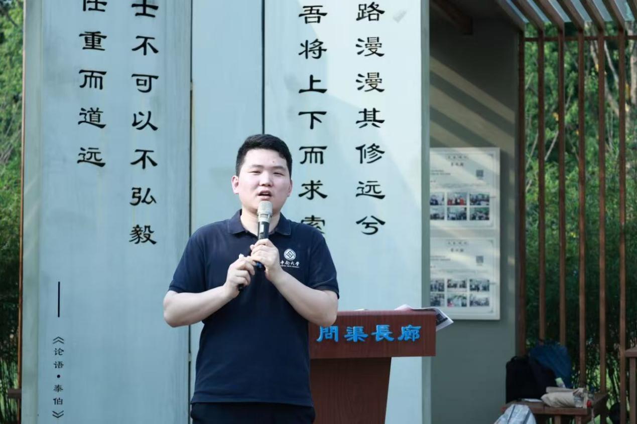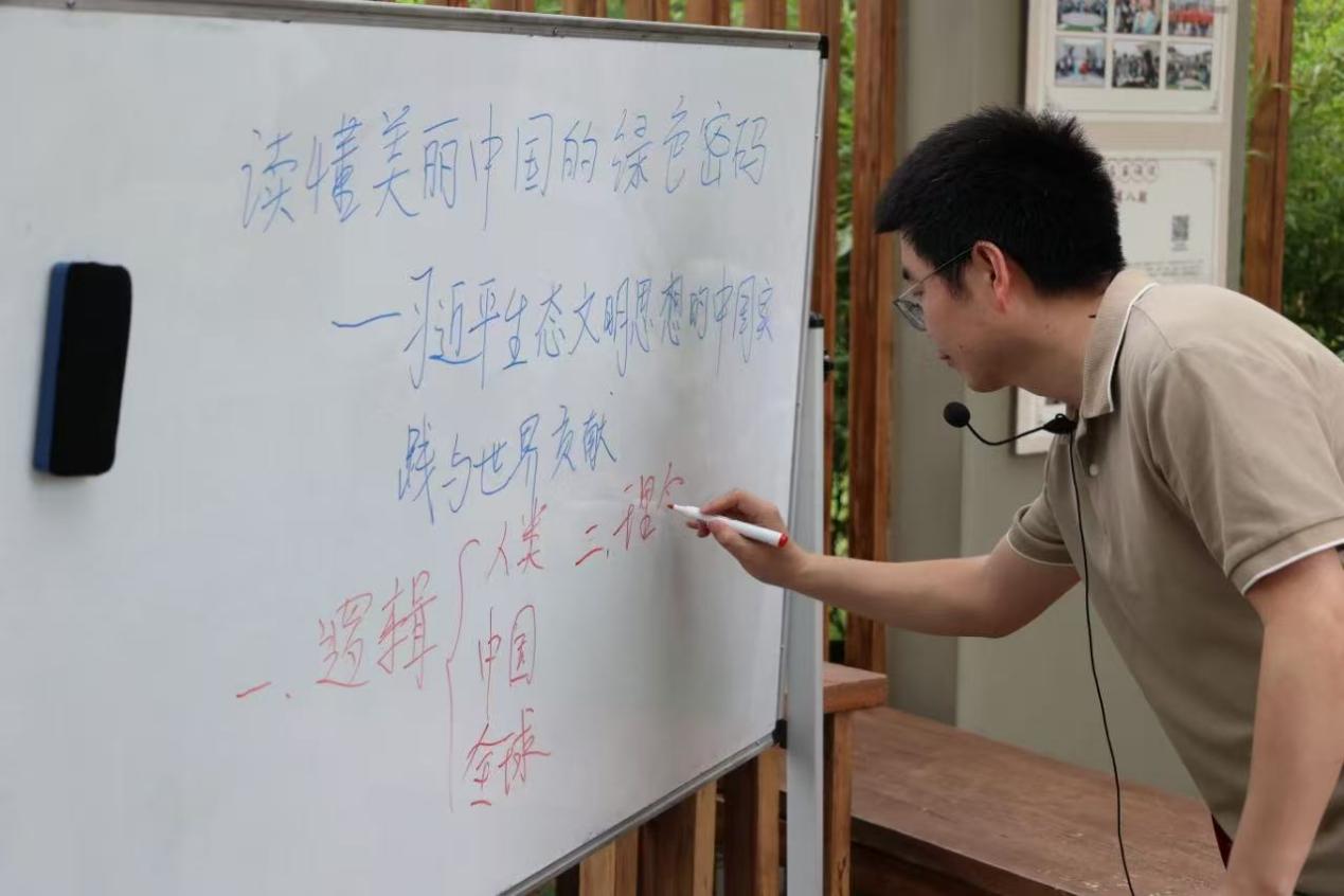 5月7日上午,李盼强老师在问渠长廊以“读懂美丽中国的绿色密码——习近平生态文明思想的中国实践与世界贡献”为题授课。李老师借湘江水质提升、学校治污防污等实例引入主题,从思想逻辑、理念、路径等方面展开讲述,结合生活实例引发思考,强调人类文明出路在于生态文明,国家应走可持续发展之路 。